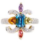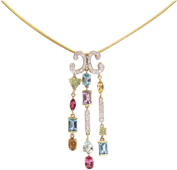 Der strahlend violette Amethyst aus Afrika, himmelblaue Topas aus Brasilien, hellblaue Aquamarin aus Sambia, olivgrüne Peridot aus Arizona, gelbe Citrin aus Madagaskar, rosa Turmalin aus Sri Lanka und der himbeerrote Granat aus Indien. Ein Feuerwerk aus Farben und Fantasie, wie aus den Schatztruhen eines Maharadschas.