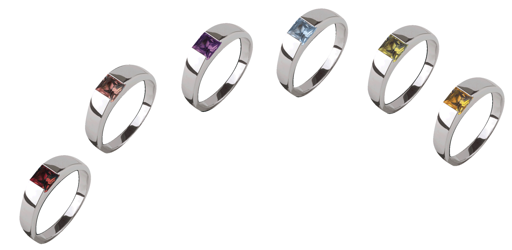 Roter Granat ca. 5,0 x 5,0 mm 0,90 Carat Rosa Turmalin ca. 5,0 x 5,0 mm 0,60 Carat Violetter Amethyst ca. 5,0 x 5,0 mm 0,58 Carat Blauer Topas ca. 5,0 x 5,0 mm 0,75 Carat Grüner Peridot ca. 5,0 x 5,0 mm 0,78 Carat