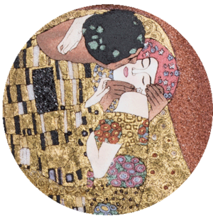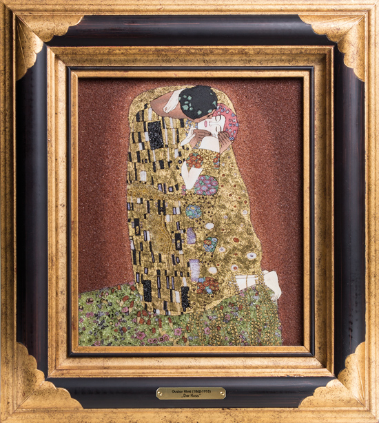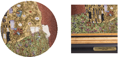 Die Reproduktion von Gustav Klimt's „Der Kuss“ aus dem Hause DRACHE erfolgt in einer weltweit streng limitierten Auflage von nur 777 Stück in reiner, aufwändiger Handarbeit unter Verwendung von folgenden wertvollen Edelsteinen: Amethyst, Jade, Jaspis, Opal, Peridot, Perlmutt, Rosa Sodalith, Rubin und Schwarzer Spinell. Durch die Verbindung der natürlichen, ausdrucksstarken Farben der Edelsteine werden Symbolkraft und Wertigkeit des Original-Kunstwerks noch verstärkt. Je nach Lichteinfall entstehen intensive, schöne Farbkombinationen, die durch das geheimnisvolle Glitzern eine eindrucksvolle, hoch emotionale Botschaft vermitteln. Die Kostbarkeit der Gewänder und des Kunstwerks wird, wie im Original, durch Verwendung einer echten 24-karätigen Blattgold-Auflage unterstrichen.