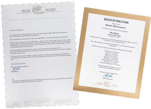 Jedes Exemplar wird mit der laufenden Nummer der Limitierung unverwechselbar auf der Rückseite signiert. Eine namentliche Besitzurkunde garantiert die Echtheit der Edelsteine und die 24-karätige Blattgold-Auflage sowie die Herstellung in aufwändiger Handarbeit in unseren Juwelier-Werkstätten. Ebenfalls garantiert werden die strenge Limitierung von weltweit nur 777 Exemplaren sowie die Exklusivität.